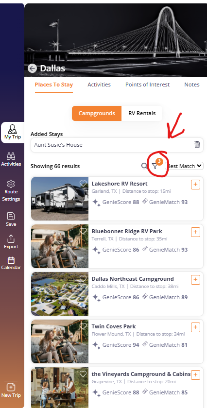 When using the Trip Planner and selecting a campground for each stop (by pressing the tent icon next to the stop name), you can select campground amenities that are important to you. If you have already set your Campground Preferences (under User Profile >> Settings >> Preferences >>), these settings will be shown in your Campground Filters when using the Trip Planner (only the "Need to Haves" will appear in campground filters, not the "Like to Haves." If you have not selected Campground Prefences under your User Profile, you can set them in the Trip Planner. However, filters set in Trip Planner will not change your Preferences.